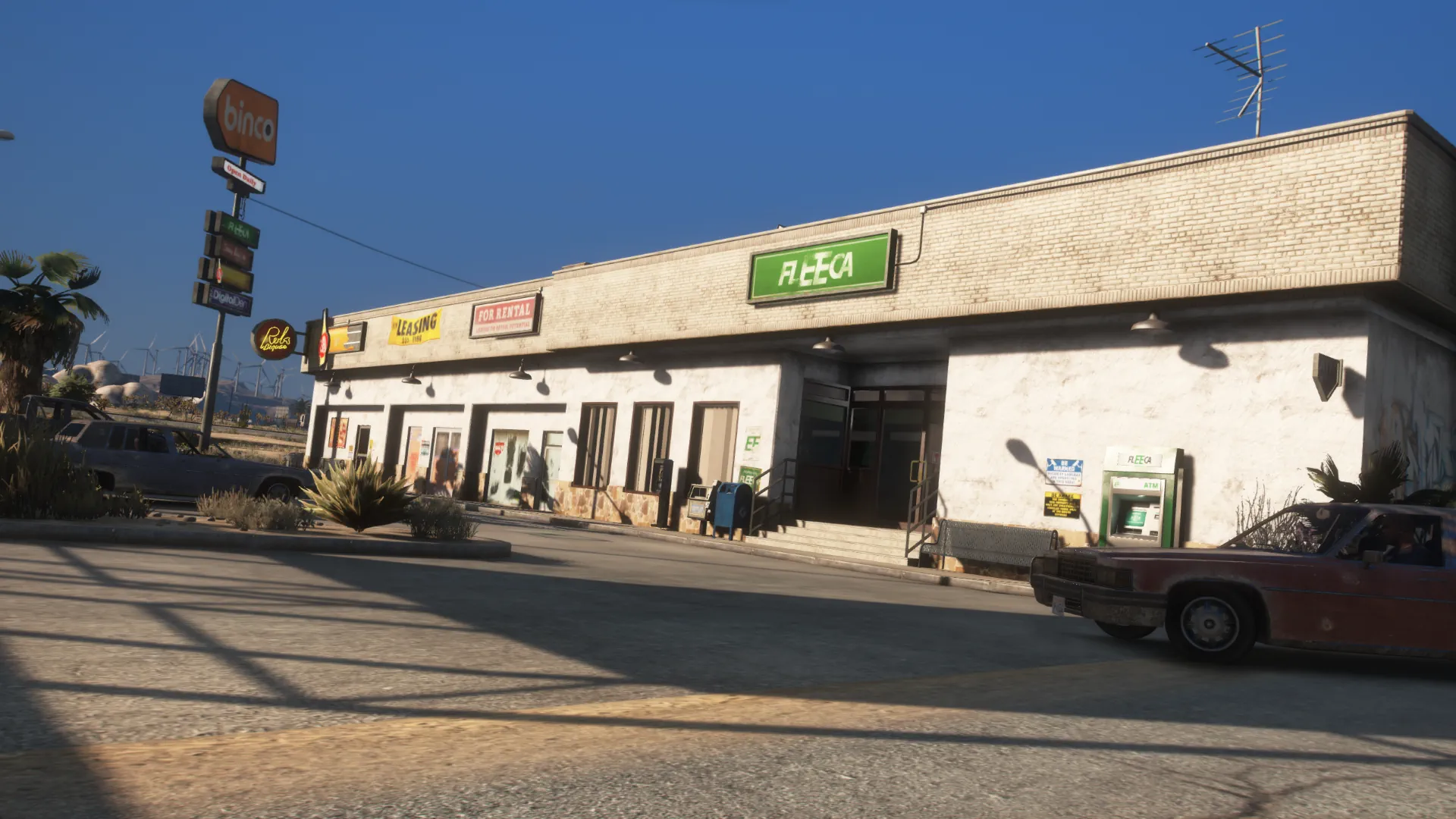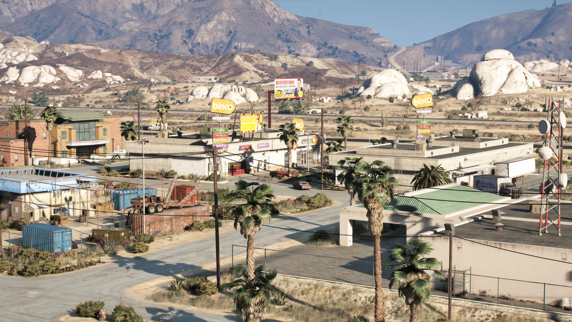 Proof that even the middle of nowhere deserves a second chance, the Sandy Shores Strip Mall is the county’s latest attempt at pretending the economy still works. Built on dust, hope, and questionable permits, it brings a taste of urban life to the desert: a Fleeca branch that loans to no one, a liquor store that serves everyone, a discount Binco for what’s left of fashion, and a lawyer’s office that mostly handles restraining orders.